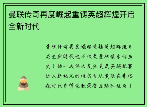 文章摘要:曼联足球俱乐部作为全球最具影响力和声望的足球俱乐部之一,经历了辉煌的历史,但近年来遭遇了竞争压力和成绩波动的困境。然而,随着新一代球员的崛起、教练团队的优化、俱乐部文化的重塑以及财力的持续投入,曼联正逐步迈向重塑辉煌历史的征程。本文将从四个方面深入探讨曼联如何实现再度崛起,重返足球王朝的巅...