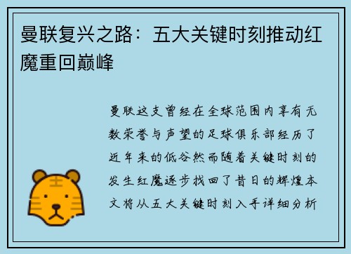文章摘要:曼联作为世界足球的顶级俱乐部之一,经历了从辉煌到低谷,再到崛起复兴的漫长旅程。自弗格森爵士退休后,曼联陷入了多年的动荡与困境,但在这个过程中,俱乐部始终未曾放弃对荣誉的追求。在经历了一系列的管理更迭、战术调整与人员更替后,曼联开始逐步恢复其竞争力。本文将从四个方面详细分析曼联重生之路:首先...